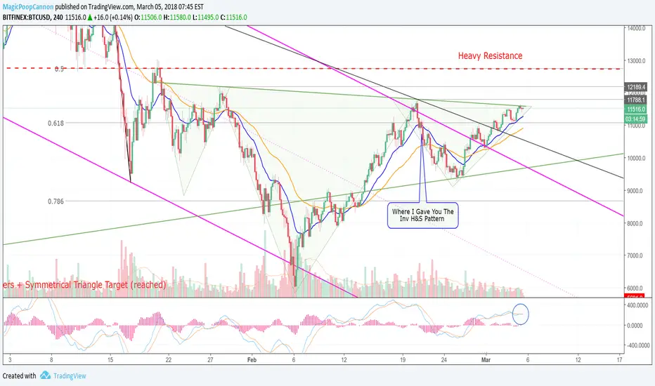 Hi friends! Welcome to this update analysis on Bitcoin! Let's get right to it! Looking at the four hour chart, you can see that BTC is testing the neckline resistance of the inverse head and shoulders pattern, as it prepares for a breakout. BTC is actually building a small bull flag just below, and it appears as though a breakout is inevitable. Volume is very light, but I wouldn't be concerned with the volume until the breakout. A lot of people have been talking about the low volume in the right shoulder, but it is typical for volume to decline as price action approaches a breakout zone. Traders will step to the side, and await a breakout confirmation, before jumping back into the market. That's the psychology behind the volume decline in the right shoulder. With that said, we can use the 20 EMA (in blue) as a strength indicator for this move. You can see how well BTC has been respecting the 20. From the low on 2/25, it rallied up and corrected into the 20 EMA, as it converged with the top of the channel. Then you can see that it rallied higher, and corrected to the top of the black trendline, which was nearly converging with the 20 EMA again. Then we had a rally up near the neckline, and a corrective move back to the 20 EMA, and now here we are testing the neckline again. So, if BTC starts to retreat, and it takes out the 20 EMA in blue, that would be an indication of short-term weakness.