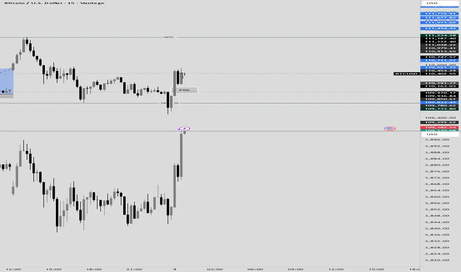 Entry: Look for confirmation (strong bullish candles or lower-timeframe shift) within or just below the FVG area.Target 1 (Liquidity): The primary target is the CRTH at $111,234.28 to clear the buy-side liquidity resting above those highs.Invalidation: A decisive close below the CRTL + TS zone (below $109,780.62) would invalidate the bullish structure and suggest a deeper drop toward the lower liquidity/support at $109,000.