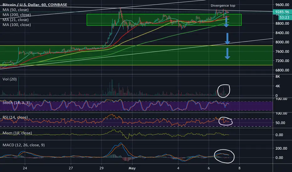 Bitcoin has now put in an RSI and MACDH divergence on the 1HR timeframe with a high volume sell candle. If we zoom out further we can see that we are in a rising wedge channel which is a reversal indicator and we have now just put in a lower high on the 4 hr charts. Both bearish signs. We may also be seeing a double top here. Furthermore this looks like a breakout fakeout of the descending trend line over many months. All in all a lot of bearish confluence with lower highs after lower highs. We have some support in the green box but if that fails we can expect a retest of the next box below at 7850. The 7850 region could be a good place to reverse and go long if the breakout of the rising wedge itself fails. However the lower highs after lower highs on the daily charts should be a concern for medium term holders.