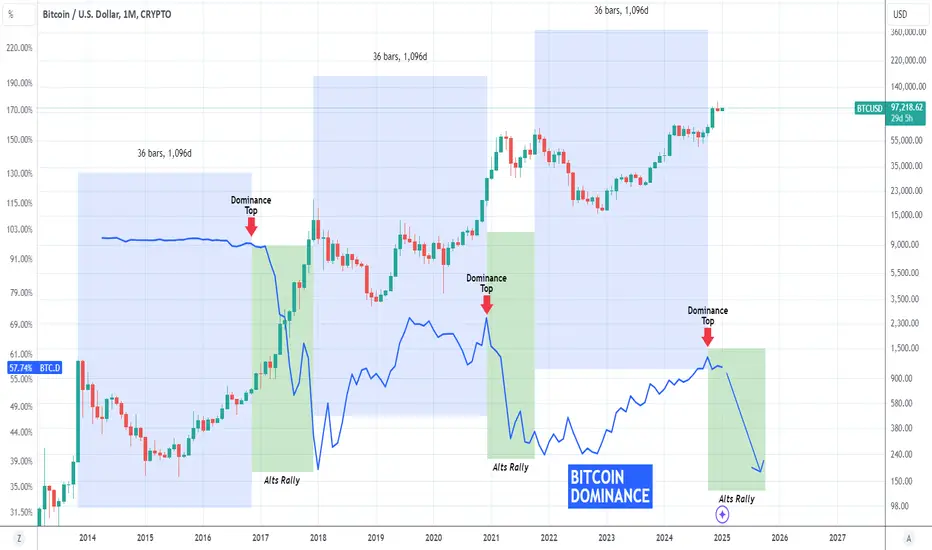 As you can see on this chart, BTC Dominance (blue trend-line) has started to decline already since October 2024. That is when Bitcoin completed 36 months (1096 days) from the previous Cycle top (green candle).