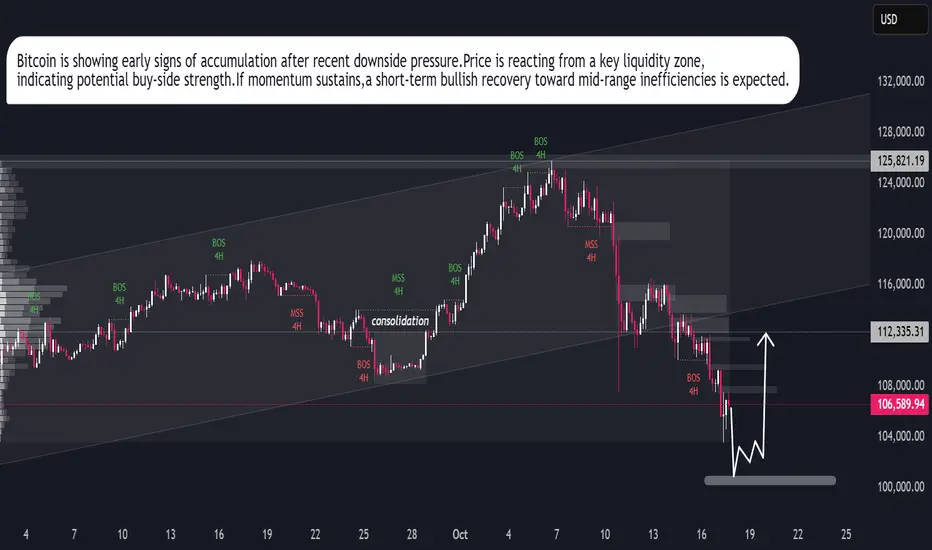 Bitcoin is currently stabilizing after a sharp corrective phase.The market is showing early signs of demand re-entry near the liquidity base,indicating potential exhaustion of selling pressure.Recent structural reactions hint that buyers are preparing to reclaim control,which could initiate a short-term recovery leg toward the mid-range inefficiency zone.If momentum sustains,Bitcoin may expand higher,confirming a potential buy phase aligned with institutional accumulation signals.Overall,the outlook remains cautiously bullish as long as the market holds above its newly formed demand area.