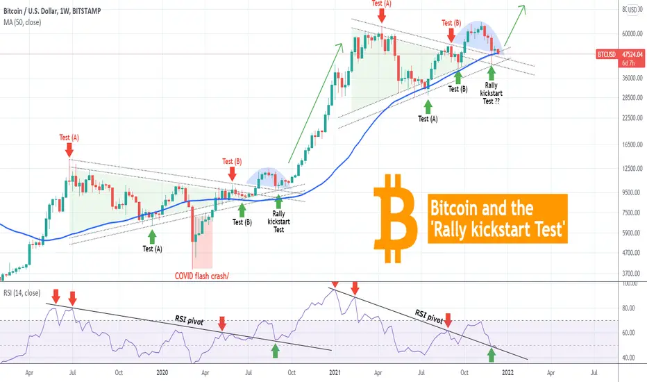 Well, you were right in doing so as by expanding this pattern and elaborating more on the similarities of the two structures, I discovered that if we look into the RSI from a slightly different perspective and by disregarding the March 2020 crash due to the COVID irregularity, we can see that the prevailing pattern is a Triangle (green pattern) that after an initial "soft" break-out to the upside (blue Arc pattern), it pulled back to test the (former) top/ Lower Highs trend-line of the Triangle. After that held the test(August 2020), the massive parabolic rally of October 2020 - April 2021 started. I call that point the 'Rally kickstart Test'. The 1W RSI followed a similar structure during that time, holding and rebounding on its Pivot line (formerly a Resistance).