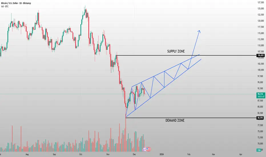 Bitcoin is currently forming an ascending triangle pattern, with higher lows establishing a clear demand zone at $80,595 and a supply zone at $106,003. This structure suggests a potential continuation to the upside if price breaks the resistance zone.