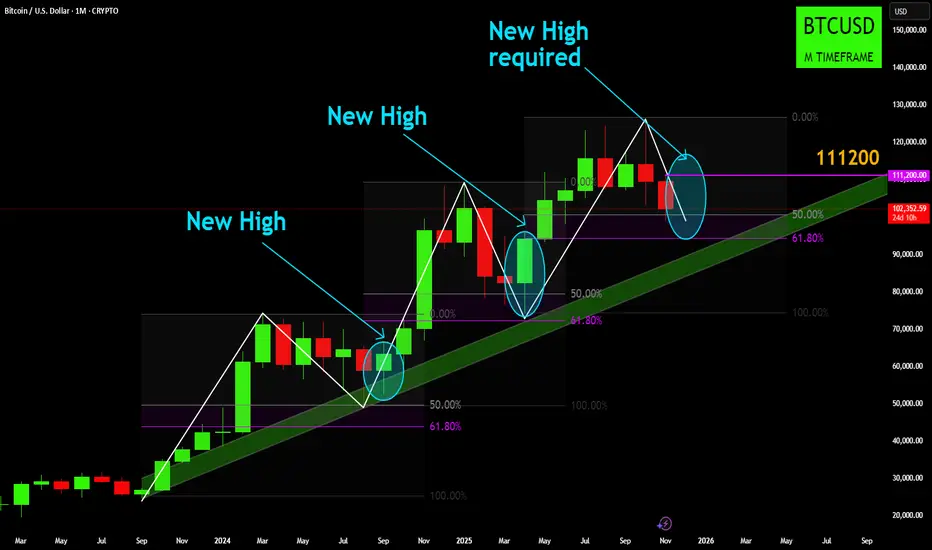 - On the monthly chart, BTC's bullish trend has followed a consistent blueprint: