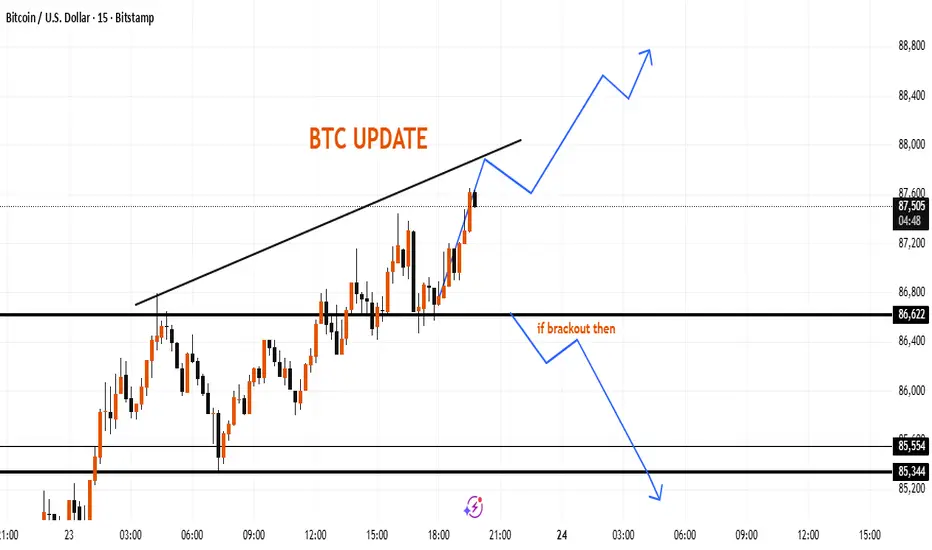 Bitcoin is currently moving within an ascending structure, approaching a trendline that has acted as a reaction zone in recent candles. If price holds above the 87,500 area, the chart suggests the potential for continued upward momentum toward higher intraday levels.