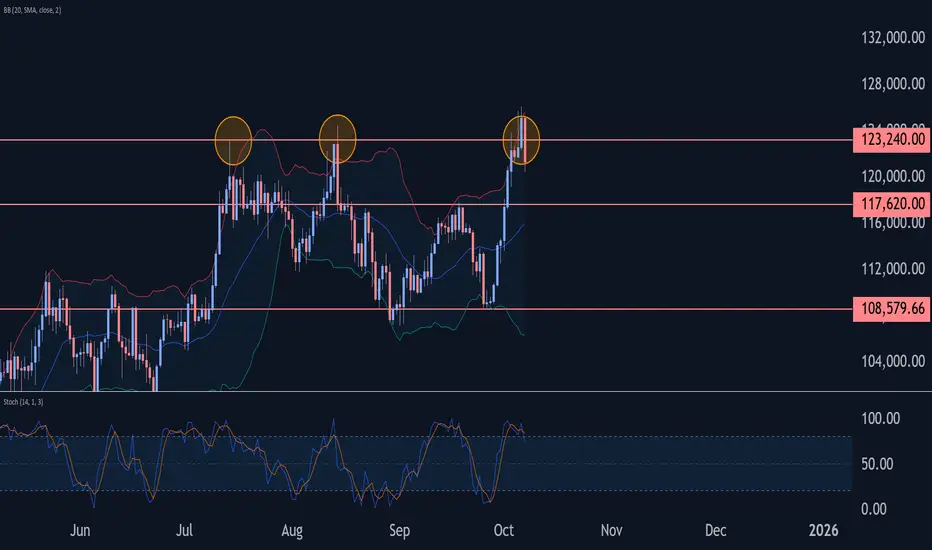 Bitcoin cryptocurrency recently reversed down from the resistance zone between the key resistance level 123240.00 (former strong resistance from July and August) and the upper daily Bollinger Band.