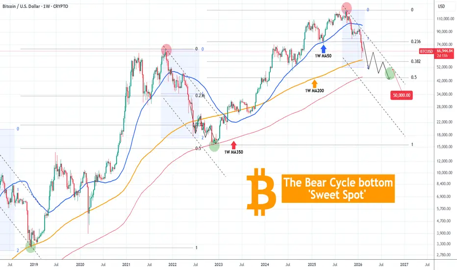 That is currently around $51000 and the Zone within that and the 0.5 Fibonacci retracement from the Bear Cycle bottom (around $45000) is the 'Sweet Spot'. Practically this is a 'no-miss' Buy Zone on a cyclical perspective where long-term investors can start feeling comfortable enough to initiate buying again. We've already discussed why a 1W MA350 (red trend-line) bottom would technically make sense, as this is where the 2022 Bear Cycle bottomed.