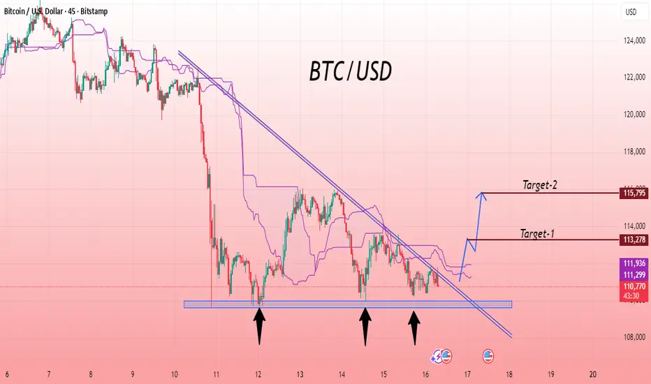 The Bitcoin/USD chart illustrates a strong accumulation phase forming near a significant support area, shown by multiple rebounds marked with arrows. Each retest of this zone demonstrates that buyers are actively defending the level, preventing further downside movement. A clear descending trendline reveals consistent selling pressure; however, recent candles indicate that bearish momentum is losing strength. This repeated defense at the bottom suggests growing buyer interest and potential preparation for a bullish reversal. If price manages to close above the descending line, it may confirm a shift in market sentiment from selling to buying. Overall, the chart reflects stabilization after a prolonged decline, with increasing signs that buyers are gradually regaining control over the market direction.