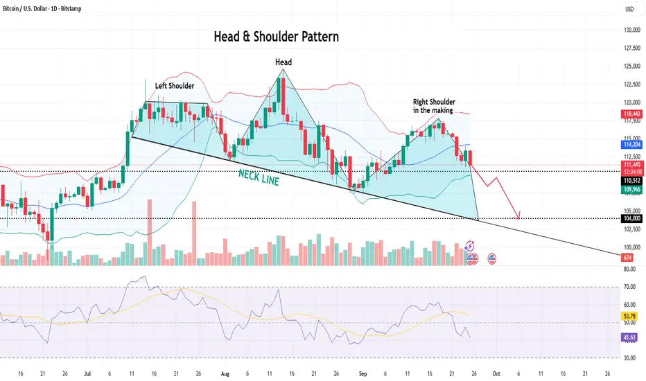 The right shoulder is in the making, and for that price might fall towards the neckline support around near 104000 level, a crucial zone to watch.