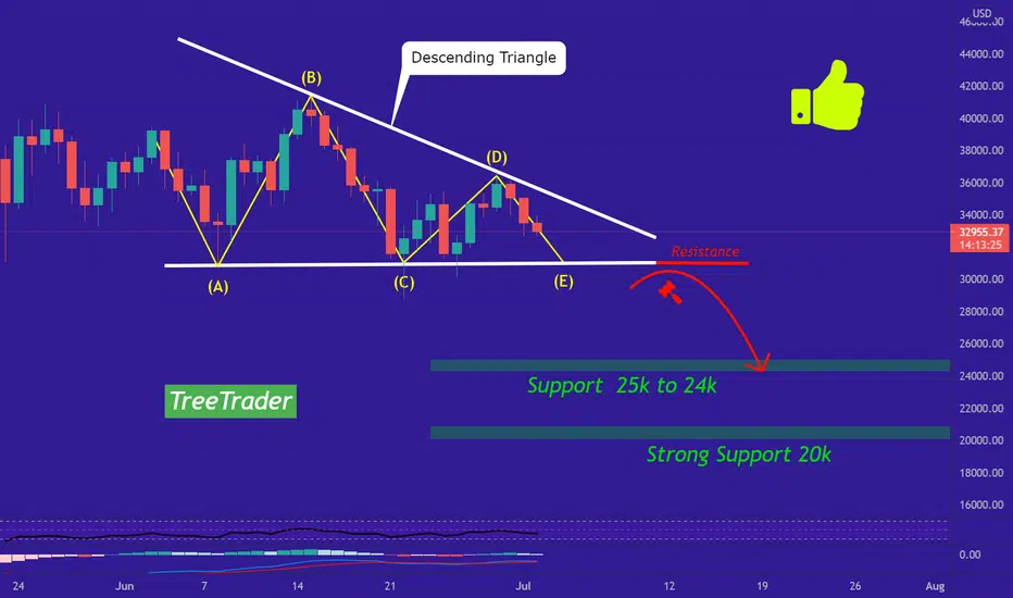 BTC/USD is forming a Descending triangle which means that the price is about to Decrease but only after confirmation which is of course the downward breakout that is expected to happen.if this pattern successfully affect the market, BTC can Decrease to 25k to 24k.( in worst case 20K!)