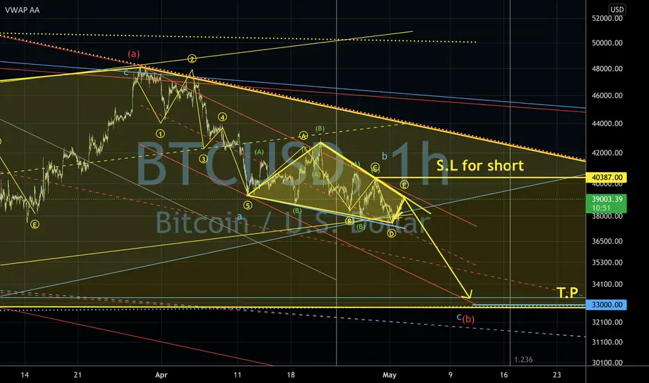 Bitcoin possible forming a small “ bearish “ triangle (highlighted) / some might view it as “bullish wedge pattern” within a bigger triangle..( highlighted background )..Price could reach @ around 33000 for wave (b)(Red) of bigger triangle ..