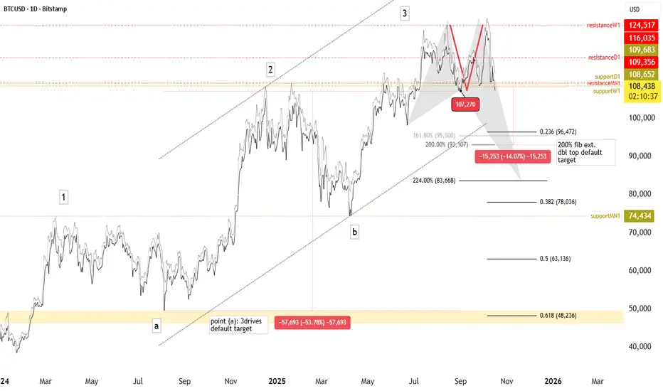 Bitcoin’s continues to capture the attention as it unfolds into a potentially critical technical formation. The chart suggests that a 3 Drives Patterna classic reversal structure — is taking shape, suggesting that the current bullish cycle may be approaching exhaustion. If this pattern completes, the projected move could lead Bitcoin down toward the $50,000 region, implying a 50% price correction from current levels.