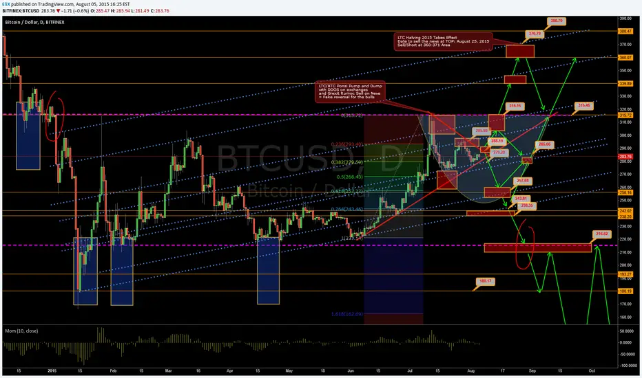 I now am convinced that a rally to 360-380 target which I estimated earlier to hit on August 25 2015 (which corresponds with the LTC Halving day (sell the news event!)) will not occur anymore solely based on my earlier explanation of the whale selling its coins at the current levels. Of course if I am wrong, the bullish scenario is still outlined on the chart (you can buy if the triangle breaks up or remain on my earlier trade buy recommendation from 276 area published on twitter). In my opinion this market maker will take the market down with him after trapping everyone at 285-31x (fake out) area to rebuy at much lower price around several key uptrend channel areas seen in my chart initially as the blue dotted lines: