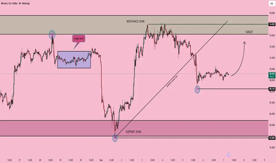 If Bitcoin maintains support above 88,245, bullish recovery toward the previous 93,500–94,000 resistance zone becomes probable. This zone remains the main area where sellers previously controlled price, so a breakout confirmation is required for further continuation.