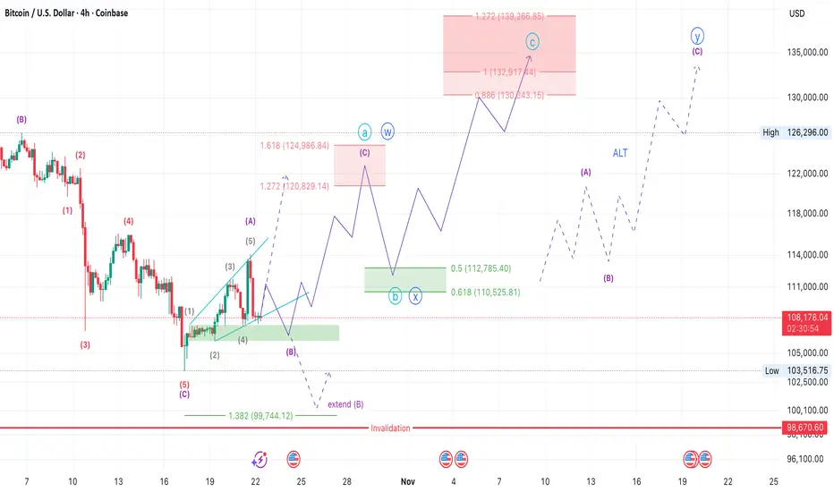 The current 4H projection suggests that BTC will building subwave (C) within a potential W–X–Y structure. The next impulsive move could lift prices toward $130K–$139K, completing the upper boundary of the diagonal before a major reversal begins.