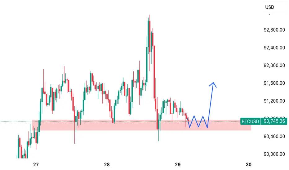 You’ve drawn a blue zig-zag line, indicating expected consolidation inside the support zone, followed by a bullish move upward toward the $91,600+ area