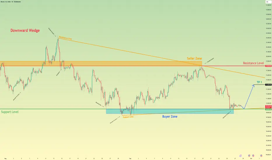 Hello traders, I want share with you my opinion about Bitcoin. The price structure has been defined by a complex and volatile consolidation following a prior downtrend. After initially forming a downward wedge, the price action has seen multiple breakouts and reversals, testing both the major 108800 buyer zone and the 118000 seller zone. This prolonged period of indecision has established a solid support base at the 108800 support level. Currently, after a recent sharp drop was absorbed by this support, the price of BTC has started to show signs of a renewed bullish attempt, moving up from the lows. In my mind, this successful test of the major support is the most critical recent event. I expect that the price will first make a final small dip to re-test this 108800 support level to confirm buyer strength. I think a confirmed bounce from this area will lead to a significant rally, as sellers appear to be exhausted. Therefore, I have placed my TP at 114000, targeting a key area of prior price congestion located near the resistance line of the larger wedge structure. Please share this idea with your friends and click Boost 🚀
