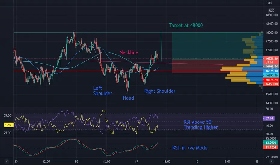 The main view of this trade idea is on the 15-Min Chart. There is a Reverse Head and Shoulders setup on the cryptocurrency Bitcoin (BTC). The Head of the setup is around the 45280 low. The left and right shoulders of the setup is at 45650 and 45600 respectively. The neckline is the trendline highlighted in red on the chart. The target is determined by measuring the distance between the neckline and the head and using that distance from off the neckline. This setup takes the target towards the 48000 price level. The Stop loss should be placed at the low below the neckline.
