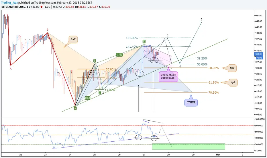 . New impulse with an AB=CD pattern completed and also a Bearish Bat pattern with target at 38.2% and 61.8% retracement;