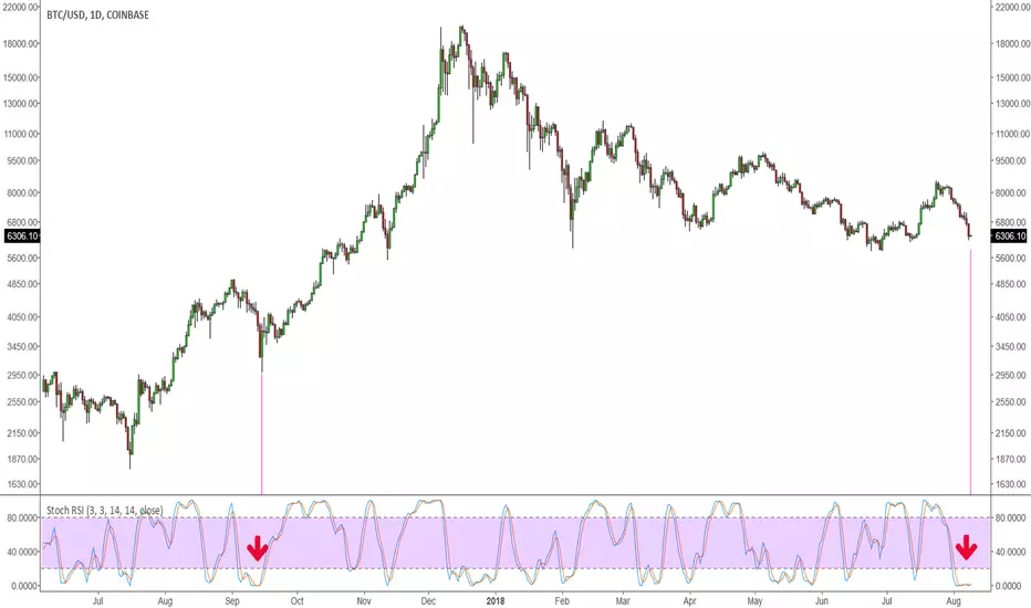 I made a peculiar observation while looking at the charts this evening. Everybody looks at the price for waves, support / resistance, fibs, etc. etc. etc. But while looking at the daily Stochastic RSI Indicator I noticed that it has basically flat-lined. That seemed odd so I went back as far as I could to find something similar. I could only find one similar occurrence. This is the chart. Make of it what you will.