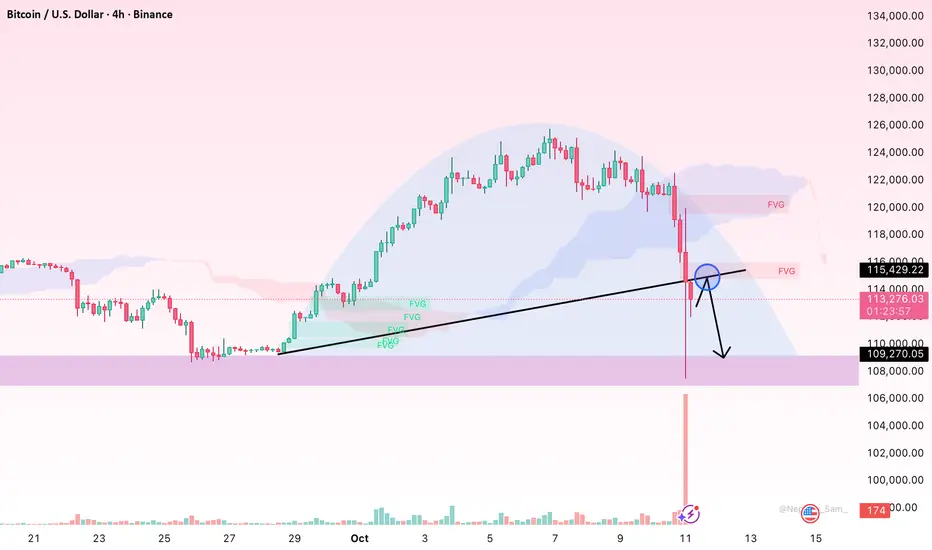 The Bitcoin market just went through a strong “brake tap” in the latest session. On the 4H chart (Binance), a deep red candle with high volume dragged the price from around $115,000 straight down to near $108,000 before rebounding slightly to $112,000–$113,000. The Ichimoku cloud was breached, and the short-term structure turned clearly bearish. Two critical Fair Value Gap (FVG) zones can be identified: $115k–$116k near the cloud edge, and $119k–$120k — the previous sideways range top. These act as major supply pockets, where any retest could decide the next trend direction.