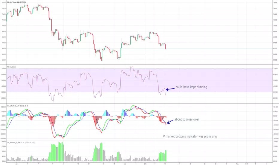 But know when to use the right ones. A lot of people were calling for a bounce to higher levels a few hours ago. Why were the promising 4H indicators shown above wrong? The timing seemed right, since we just got through a massive bull run, and now we're down. You can see the extent of the runs on the 1H, but the pumps kept getting rejected. It's not unlike bitcoin to bust through that anyway. Many people point at this and call manipulation, notably. The 4H as highlighted shows promising signs on MACD, RSI, and probably a great deal of other indicators.