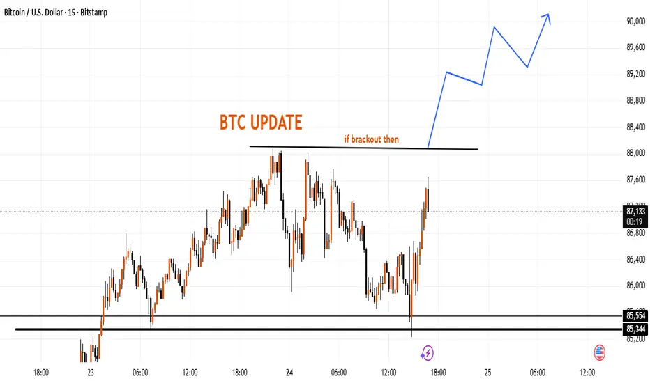 This chart highlights an important resistance zone around the 88,000 area. If price manages to move firmly above this level, the market may continue forming a higher-timeframe structure toward the 89,000–90,000 region.