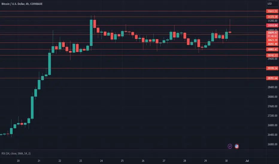 BTC Bullish engulfing on last 4h close, current 4h attempted to follow up but currently with a wick looking ugly. $31,010 resistance holding, $30,623 support testing. Less than 2h to close current 4h, must close above $31,010 to avoid $30,282 support test.