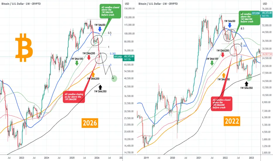 As you can see, the 1st selling wave found support on the 1W SMA100 (green trend-line), consolidating for several weeks (closing all weekly candles above it) before crashing into the 2nd wave. So far that held perfectly in the 2026 Bear Cycle as well, it even stayed below the 0.5 Fibonacci retracement level as in 2022.