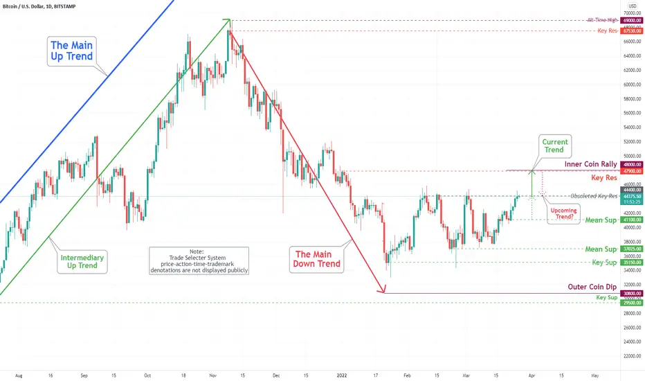On Friday's session, the coin briefly traded above our Key Res $44,400 and obsoleted: a significant psychological price level, and continuously pushing to Key Res $47,900 and Inner Coin Rally $49,000.
