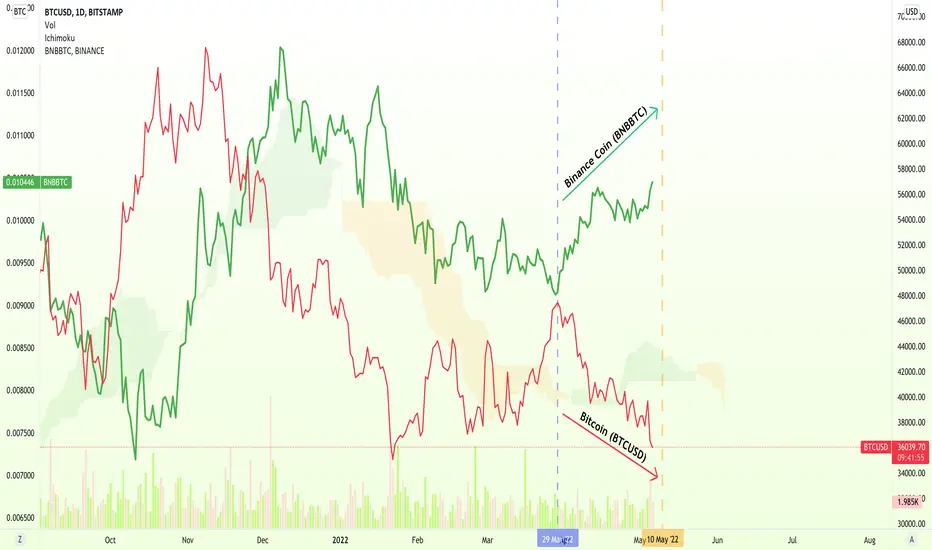 We see a clear negative/inverse correlation between Bitcoin (BTCUSD) and Binance Coin (BNBBTC)... We can turn this into something good.