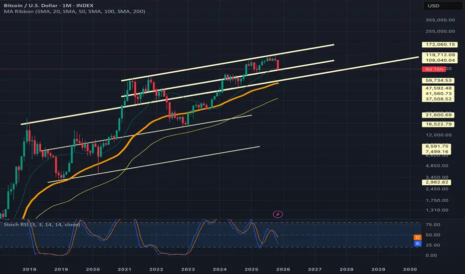 With the trendlines of this channel slightly shifted we can see that it is possible that priceaction has already tested the top trendline of the channel. However in my previous version of this idea which I will try to post below it hasn’t connected with the top trendline yet. Would make more sense for it to be having the rejection it is having if it has already retested this top trendline though so I decided to post this version of the chart too so I can keep an eye on both. Even if somehow this does signal some sort of top it looks like we have very strong support on the next trendline just below the current one which should have the monthly 50ma double reinforcing its support in the very near future. SOo in that case that 50k zone there should hold strong support,but hopefully this is So another correction and not the top in which case the current trendline we have just retested will hold support. *not financial advice*