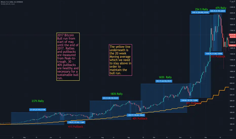 I measured the rallies and pullbacks from the peaks and troughs. The yellow line underneath is the 20 week moving average which needs to be held to maintain our bull market. We currently about 41% above the 20 week moving average. A pullback of 30% would bring us to the 20 week. I am extremely bullish on Bitcoin but I am prepared for 20-30% pullback to open before we rally higher.