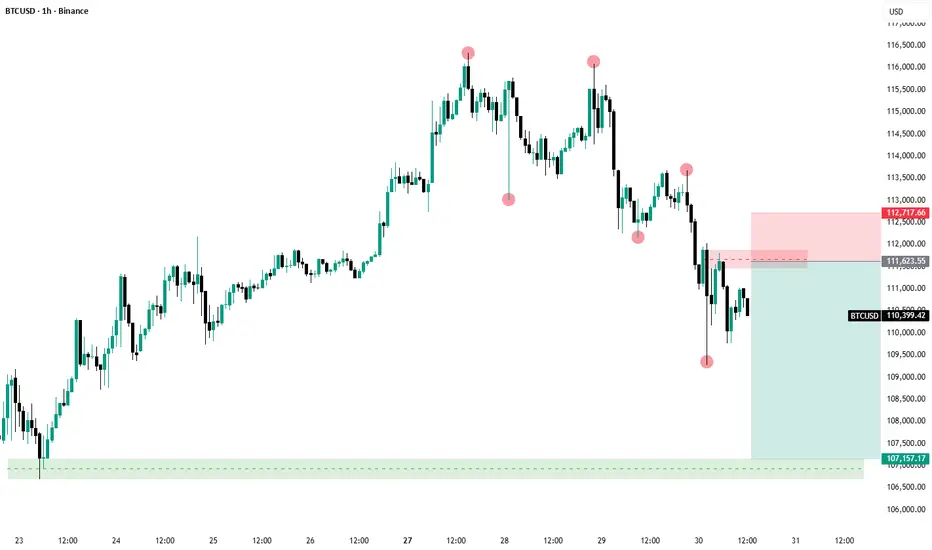 The stop loss is strategically placed just above the resistance at $112,717.86 to manage risk, while the ambitious take profit target is set much lower at $107,157.17. This target aligns with a major liquidity and demand zone (the green box) that was instrumental in launching the previous rally, offering a highly favorable Risk/Reward ratio.