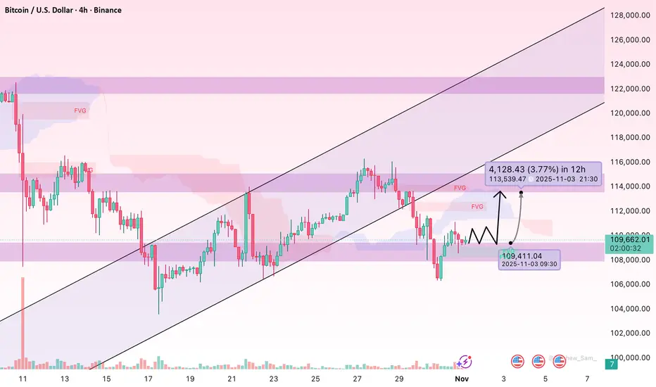 Bitcoin is currently trading around 109,600 USD after a technical rebound from the 107,800 USD bottom. On the 4-hour chart, price filled the Fair Value Gap (FVG) between 108,000 – 110,000 USD and then quickly retreated — a classic sign of a medium-term correction rather than a sustained reversal.