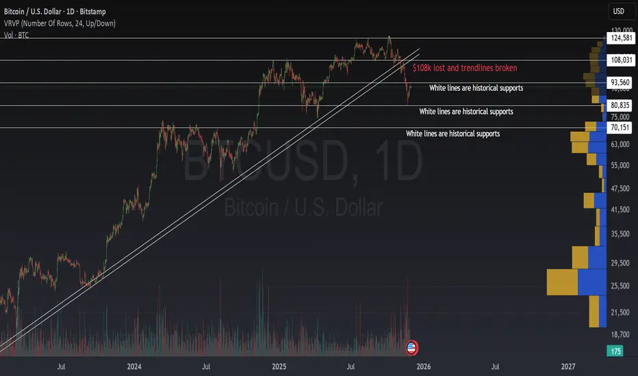 On the chart, BTC didn’t just break the trendline. It also lost the $108k level, a key resistance-turned-support that buyers had protected again and again.
