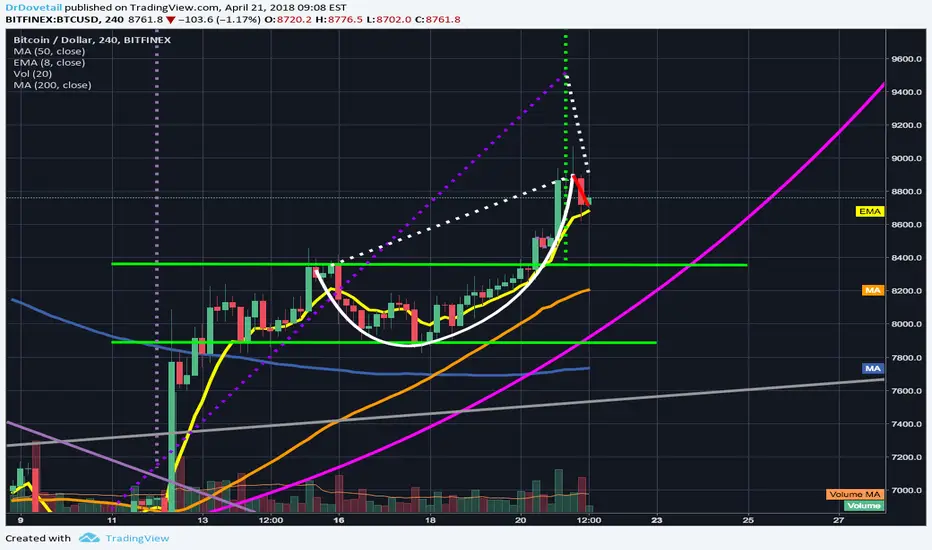 Great upswing yesterday just as I was hoping and we are still continuing to play out this potential Eve double bottom quite perfectly. Eve bottoms have a much slower climb than traditional double bottoms and tend to fake out a lot of bears along the way with many a bear trap. We are currently consolidating with some inside bars and we are overdue for a retracement...we may fall back down to around the top trendlien of the bullflag we broke out of on the night of the 19th to form a higher low and then continue ridsing from there....however this current price action on the 4hr chart looks suspiciously like a slanted cup and handle....I'm not entirely sure if cup and handles can be valid at this angle but have charted it just in case.....if it is a cup and handle and we break the neckline after now having formed the handle then the projected upswing target should take us to 9400 which was the original descending wedge breakout target so we will finally reach that projected target which if you look at the price action since that breakout it really has only been higher lows and higher highs...a clear bull run so far. For now though I will keep this idea neutral as we may have a slight retracment which we are overdue for that takes us back down to the top trendline of that april 19th bull flag...if so I will simply buy the dips...you choose your own path though because this is not emant to be financial advice. Thanks for reading and good luck! Also if anyone who is a cup and handle expert sees this and can chime in on whether or not this one can be a valid cup and handle it is appreciated..I know in the standard stock market...patterns like this are suppose to form over a much larger period of time...but in crypto every thing seems accelerated and I've noticed these longer time frame patterns being triggered and validated on much shorter timeframes.