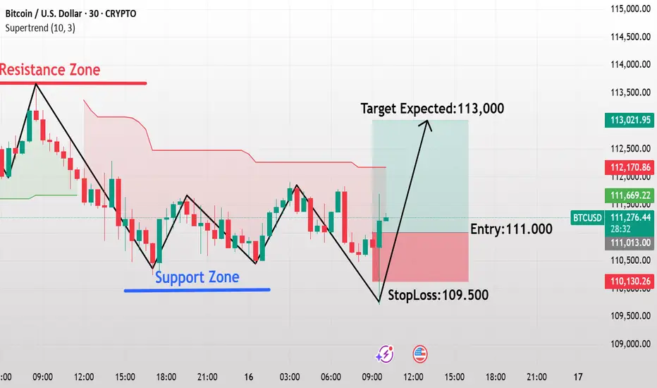 Bitcoin is attempting a rebound after testing its support area near 109,500. The current structure indicates that price has found a base within the demand zone, with short term buyers stepping in. A break above the recent minor resistance could open the path toward the 113,000 target zone, aligning with the ongoing recovery momentum seen in broader risk assets.