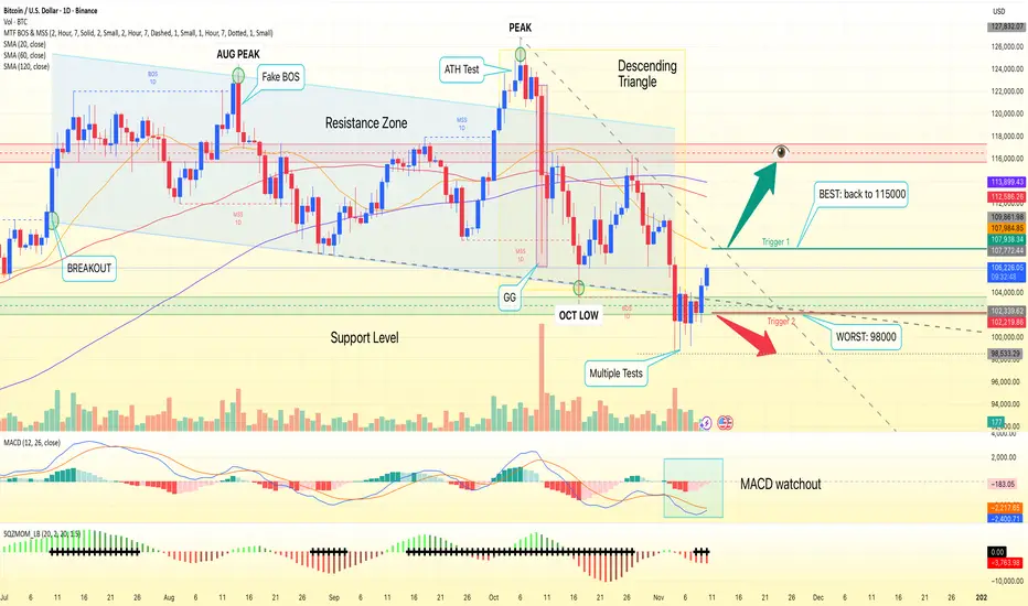 Primary path: sellers defend $108,000–$110,000 and force a fresh breakdown through the $102,500 floor. A daily close below $102,400—or more decisively, a break-and-hold under $102,000—would confirm continuation, opening the psychological $100,000 handle, then $98,400. That aligns with the triangle’s bearish follow-through and the still-subzero MACD despite fading downside momentum.