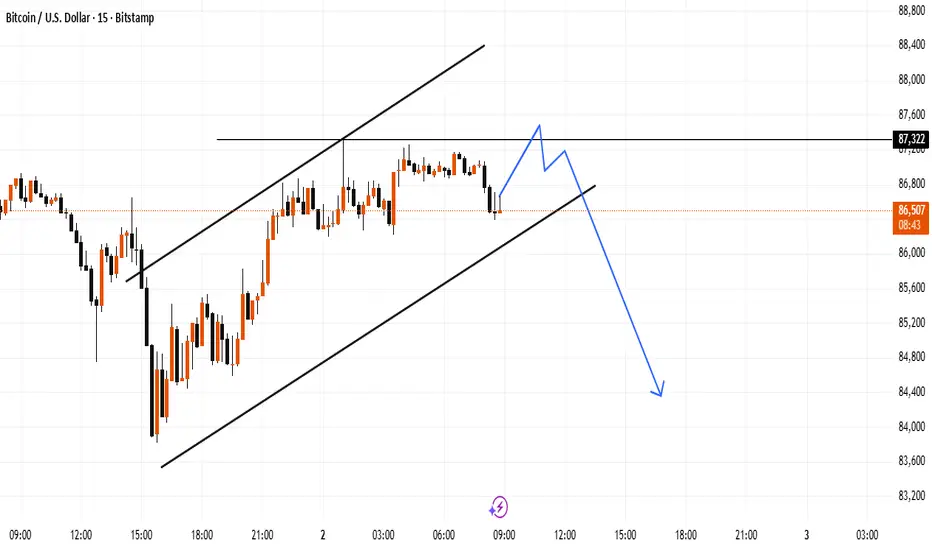 Bitcoin is moving inside an ascending channel, with price recently touching the lower boundary of the structure. The chart also highlights a reaction zone above, showing where price has interacted multiple times. The projected path illustrates a possible scenario for how price could behave within this range, focusing only on chart structure and levels.