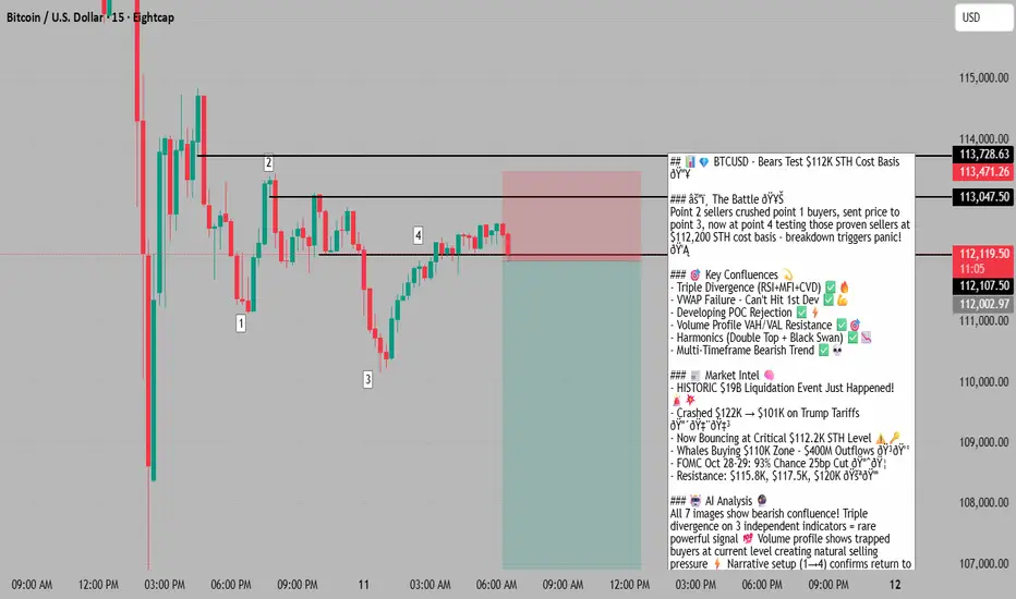 The setup narrative tells a compelling story of bearish momentum building after Bitcoin's recent all-time high rejection. At point 1, aggressive buyers pushed price to new highs above $113K, creating a local peak at point 2. However, these buyers were decisively rejected, and sellers took control, driving price down to point 3 below $111K - proving that point 2 sellers were stronger than point 1 buyers. Now at point 4, price has returned to test these proven sellers around $112,200. This is the critical STH (short-term holder) cost basis level where recent buyers entered. If this level breaks, it could trigger panic selling as these recent entrants realize their positions are underwater, potentially accelerating the move to the downside. The trade thesis is that the return to these proven sellers at point 4 will result in another rejection, continuing the bearish pressure established when price broke below point 1.