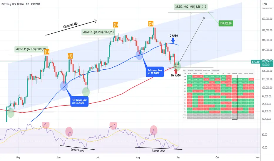 Statistics aside, the market has a strong case of a bottom on the current levels and that's purely a technical one. As you can see, since May 01, Bitcoin has been trading within a Channel Up. This pattern has seen so far two Bullish Legs of almost identical rise (+22.07% and +21.05% respectively) and when they corrected (Bearish Legs), the first Low was on the 1D MA50 (blue trend-line) and the second on the Channel Up bottom.