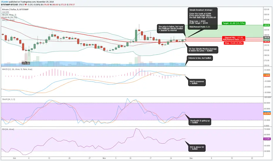 As explained on the chart the goal of this breakout strategy is to avoid risk and therefore the trade should only be entered if the price breaks above the last high of $386.60 on Bitstamp, because this is the last and most important signal to confirm a new uptrend. (Please zoom in to better see the candlesticks).