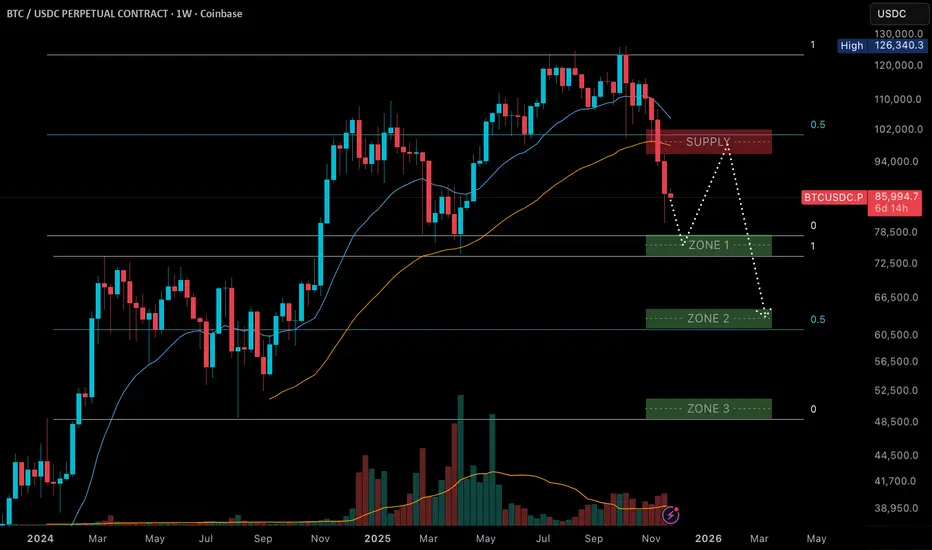 My last TA was on point at the top. However, the initial target isn't met yet. As we broke the weekly trend already, I expect a kind of a pullback to the supply (re-distribution area) and then back down.