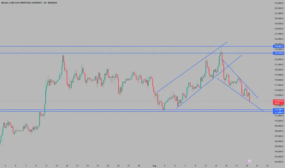The price is approaching the major support zone (near 112,000). If this holds, a bounce is possible; if it breaks, further downside could occur.