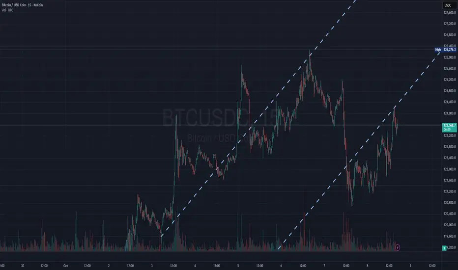 Bitcoin is climbing a clean rising channel 📈 — higher highs and higher lows forming a short-term bullish structure. Watch for a breakout above 126K or a breakdown below 122K to confirm the next move. #BTC #CryptoTrading #TrendChannel