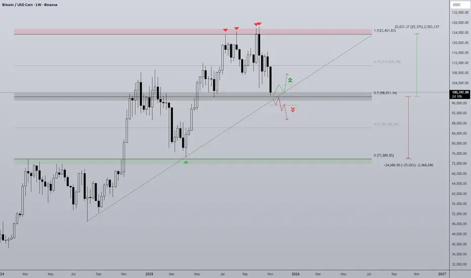 The chart clearly defines the structure of the move since the beginning of 2024. Once breaking above last cycles ATH of ~$69,000 BTC's price has moved in relatively typical fashion for a bullrun uptrend. The tariff war marking the range low back in April and the highs have been capped at ~$125,000, on 4 separate weeks this area has rejected and remains major resistance.