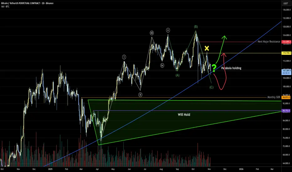 BTC failed to make a significantly higher local high (yellow x). It is still holding the parabola, however I believe a break below (at least briefly) is increasingly likely. Regardless, there is strong support nearby. How it behaves if it hits that support will suggest whether its bull run is over or not.