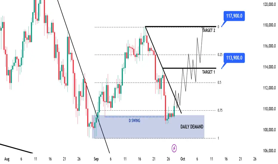 BTC is trending strongly bullish on the HTF, so long setups remain the priority. Recently, price broke the bearish trendline that had capped price action since August 13, signaling a shift in momentum. That breakout created a Daily Demand zone, which was tapped once before price moved higher — confirming liquidity inside the zone.