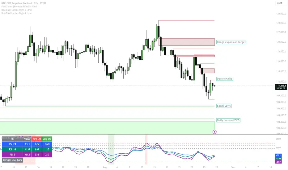 BTC is compressing below the decision level at $112,000. Liquidity is stacked at Equal Highs $112,300–$113,700 and Equal Lows near $107,000, with a daily demand/FVG around $104,000. Expect a quick liquidity sweep before direction is chosen.